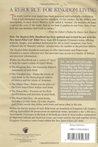 The Hayford Bible Handbook continues to offer charismatic and Pentecostal Christians a major reference tool that provides easy access to a wealth of biblical and practical information. Are you a Spirit-filled Christian who longs for fresh insights from the Bible? Do you want God’s truth to challenge you, and change you, and bless others through you in ways you never thought possible? The Hayford Bible Handbook is an unparalleled resource that unveils the Keys to Scripture uniquely, providing not only a wealth of information, but also a spiritual stimulus that will encourage your faith and service to Christ. FeaturesKingdom Keys to opening up Spirit-filled life emphases in each Bible bookAn informative Survey section for each book of the BibleHundreds of Kingdom Life Insights™, offering Spirit-filled life perspectives on individual verses A Truth-in-Action chart for each Bible book, highlighting practical principles and specific actions that might grow out of them The unique Spirit-Filled Life® Encyclopedic Dictionary with over 1300 entries, including word studies and Kingdom Dynamics articles Visual Survey of the Bible
